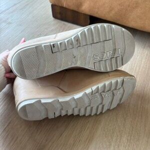 Sorel Evie wedge platform taupe ankle boots size 10. Gently worn. Elastic has some give. Still has a lot of life in this pair. These are so comfortable! Some discoloration on outsole due to normal wear.