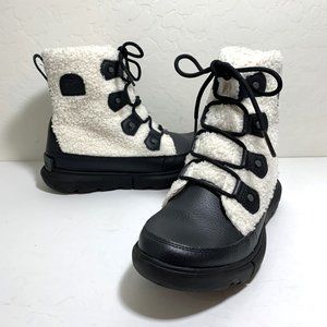 NEW Sorel Explorer II Joan Cozy Boots Faux Fur Lace Up Booties Black Sea Salt Size 7.5
