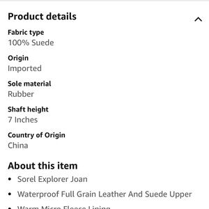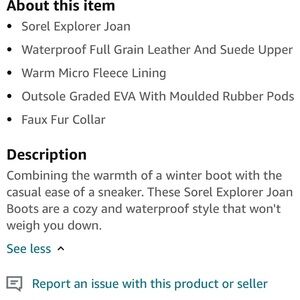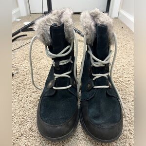 I colored Joan boots by Sorel give a classic winter style in a fully functional boot. Waterproof suede and leather upper, micro suede lining, and faux fur trim help these cute boots keep your toes warm and dry. Boots do show discoloration and nubbines on the suede, including the upper toe box. Mid sole foam does show some creasing. Fir shows some matting. Structurally the boots are sound, and still have plenty of life left as solid outdoor boots. See pix for full scope of condition.