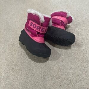 Sorel commander snow boots in vibrant fuchsia and black size little kids 13 lightly used. Cozy faux fur trim. Sturdy, rugged soles.