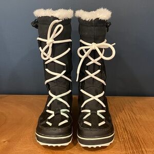 Excellent Condition! Black waterproof side with white detailing, slip resistant rubber sole, lace up, shearling lined. Measure 12.5" from floor to top of boot shaft
