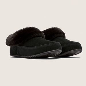 Sorel Go Coffee Run Slippers Black Suede Leather Fur Slip On Shoes NWT