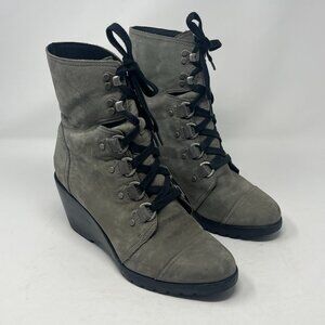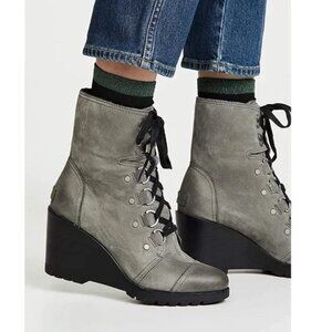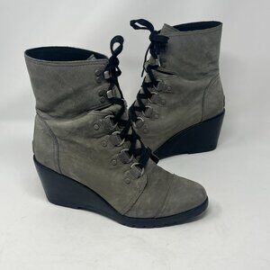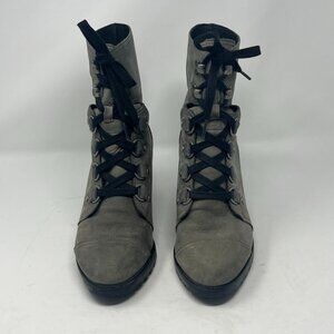 Stylish gray ankle boots by Sorel. Features a black wedge heel. Lace-up design for a secure fit.