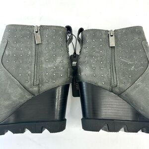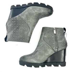 Stylish gray ankle boots by Sorel. Features a studded design and wedge heel. Perfect for any occasion.