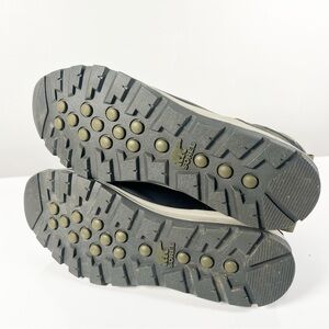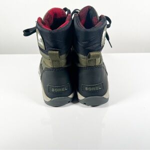 Stylish Sorel winter boots. Green upper with black accents. Durable and warm for winter wear.