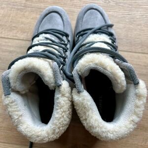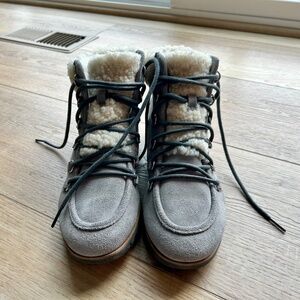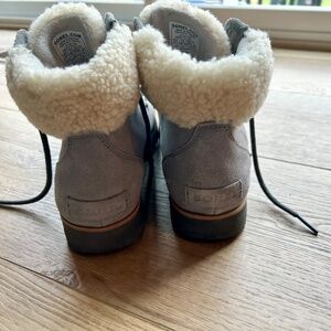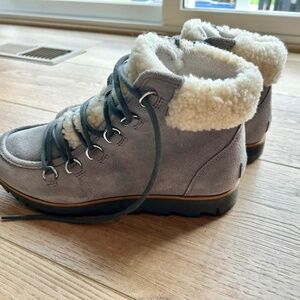 Super cute Sorel Harlow lace up booties in grey with faux shearling. Warm and cozy! I wore these once and just wasn’t reaching for them because I don’t really wear anything that coordinates with grey. These are in excellent, almost new condition!