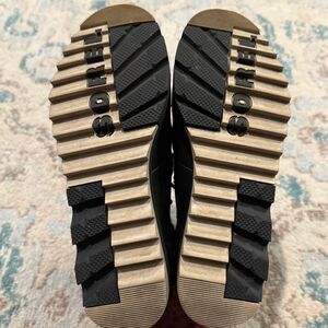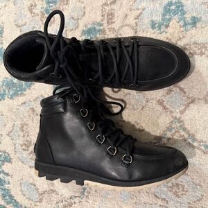 Sorel Harlow waterproof black leather lace-up moto ankle booties. So cute for fall/winter! Women’s size 8. Very good used condition- no major flaws.