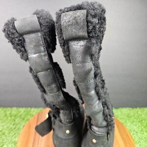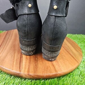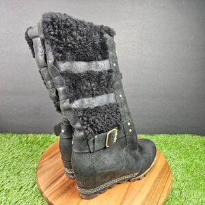 Sorel Helen Holiday Shearling Wedge Boots Size 8 Black Knee High Zip Leather Pom