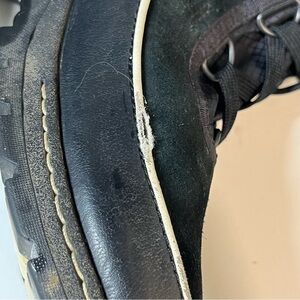 Gently used in nice condition with one flaw. Inside lining of the shaft is ripped. Does not affect the integrity of the boot. There is some peeling on the piping as shown in pictures