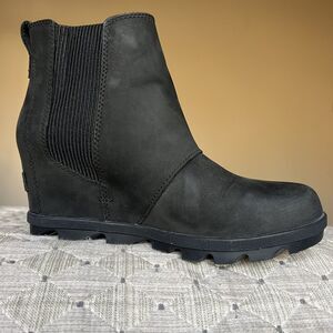 These weathered black Sorel Joan of Arctic boots are a women's size 8.5. These Chelsea boots feature a round toe and a comfortable hidden wedge heel with a height of almost 3 inches. The pull-on closure makes them easy to wear, while the rubber outsole provides non-slip traction and waterproof protection during travel, activewear, or casual outings. Crafted from high-quality leather, these boots are perfect for fall, spring, and winter seasons. The ankle shaft style and solid pattern make them a versatile addition to your wardrobe. These Sorel Joan of Arctic boots are an excellent choice for those looking for comfort, style, and functionality in one package.