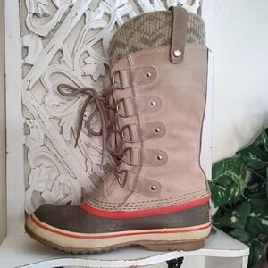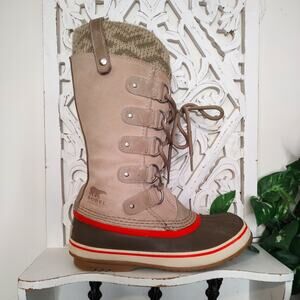 Sorel Joan Of Arctic Knit Waterproof Lace Up Snow Boots in ‘Fossil’ Tan Size 6.5. Waterproof suede leather upper. Rubber sole.