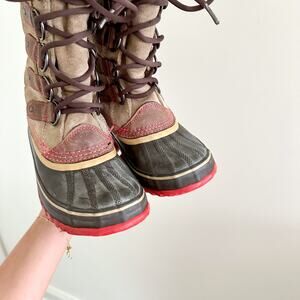 Details: Sorel Joan Of Arctic Lace Up Mid-Calf Lace-Up Winter Boots - Size: 5- Color: Brown/Black- Material: Synthetic/Leather- Features: Lace-up closure, mid-calf shaft, round toe, faux-fur, rubber outsole, logo, warm lining, comfort, breathable, outdoor, casual.