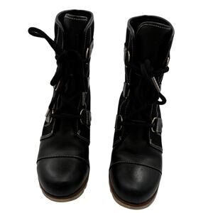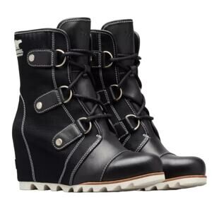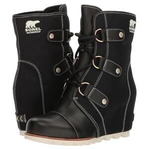 For the woman who knows no limits, this limited edition exclusive celebrates the 10th anniversary of the classic Sorel Joan of Arctic boot. A sassy city boot meets comfy wedge, this upgraded Joan is dressed up sleek waterproof nylon and waterproof full grain leather, with gold hardware and a contrast color sole to boot. Dare to adventure. Dare to defy. Dare to Joan. Upper is waterproof nylon and waterproof full grain leather. Pig skin lining. Removable molded EVA footbed with heel cup and arch support, pigskin topcover. Molded BPU-PU midsole wedge. Molded rubber outsole. Nl2767-010. In preowned condition, has some discoloration to the rivets, and general wear to the boots. Please review all photos to review condition.