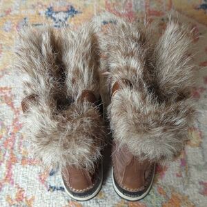 These amazing boots are top quality as they perfect winter function and style, showcasing a waterproof suede leather upper with a faux fur collar and a rubber sole for grip. They were built for long-term durability, comfort and protection as they have a seam-sealed waterproof construction, recycled felt insulation, and a handcrafted waterproof vulcanized rubber shell. They feature a 12.5" mid calf shaft height, lace up front, and gripped herringbone outsoles for secure footing. They are brown, black, and beige in color with a hint of red. Their logo and 'waterproof' is embossed in the suede on the side of each shoe and there are brand tabs on the heels of each shoe. Extremely stylish whether it's snowing or not! Easy to pair with your favorite jeans and sweaters! Simple, cute, and practical!