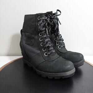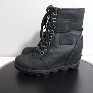 Sorel Joan Of Arctic Wedge II Boots Women 7.5 Black Canvas AND Leather Lace Up Waterproof