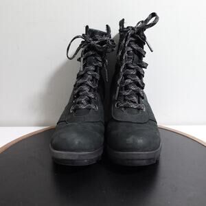 Pre-owned in good condition. These boots feature a durable canvas and leather upper with minor wear, including light scuffing on the toes and some surface marks. Soles show minimal wear and have great tread. Stylish lace-up design with a hidden wedge and rugged waterproof construction—perfect for both function and fashion. Size Women’s 7.5 (EU 38.5).