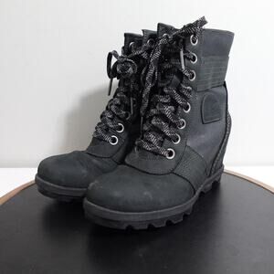 Sorel Joan Of Arctic Wedge II Boots Women 7.5 Black Canvas and Leather Lace Up