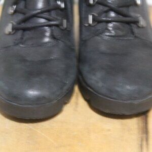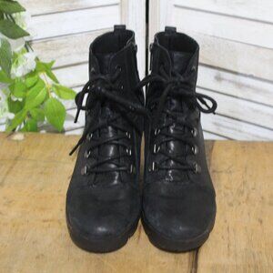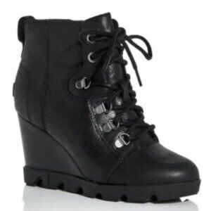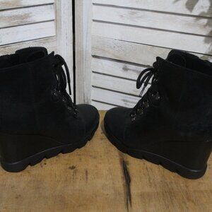 Sorel Joan Uptown Lace Boots size 9. Black leather wedge ankle boots. Rubber non-slip Tred soles. Round toe, Lace up, functional zip at side, Waterproof nubuck leather upper, Logo at heel, 3.25" stacked wedge heel, Nubuck leather upper, leather lining and sole. Shaft is 4.25in. Gently Worn with some light scuff marks. Retail for $240. (O25)