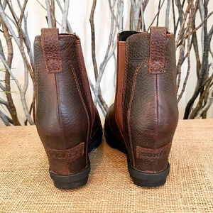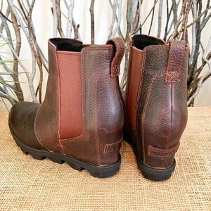 Sorel Joan of Arc Wedge II Chelsea Brown Waterproof Leather Ankle Boots. Features leather upper, hidden wedge, pull on styling with elastic side goring, removable insole, rubber traction outsole.