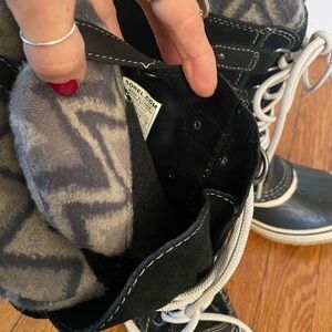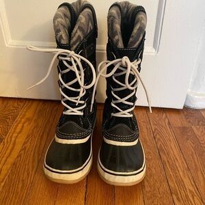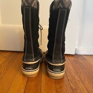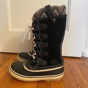 Sorel Joan of Arctic Knit II waterproof boots with black suede and a chevron felt in size 7. Leather rubber soul with rounded toe, lace up Joan of Arctic gets a fresh update with the Chevron Print knit cuff. The felt inner boot will keep your feet toasty. Vulcanized rubber herringbone traction outsole. These boots are in very good preowned condition.