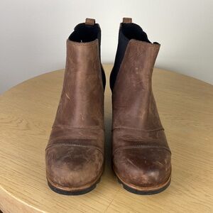 Stay stylish and supported in any weather with these Sorel Joan of Arctic Lea Wedge boots. Designed as a pull-on waterproof wedge bootie, they offer a sleek, weather-ready look ideal for winter, snow, and outdoor conditions. Made with durable leather and rubber, they feature a reliable tread and comfortable fit for all-day wear. Some light scuffs from previous use—see photos for exact condition.