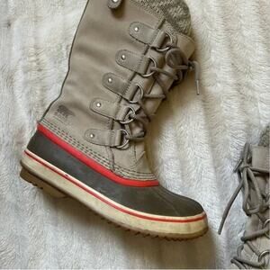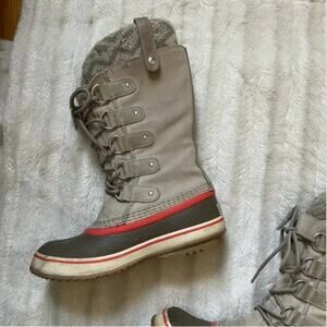 In preowned condition with some wear as shown and a spot where the snap closure is broken, still perfectly warm and functional with limited wear to the soles. Lace up. Knit detail.
