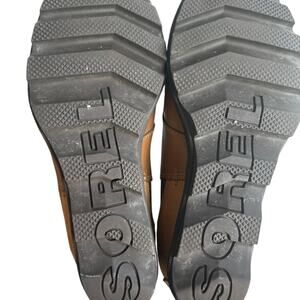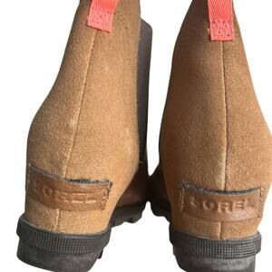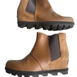 The Sorel Joan of Arctic Wedge II Leather Chelsea Wedge Boots in women's size 5 are a stylish and versatile choice for casual occasions. These ankle boots feature a round toe, wedge heel, and are made of brown leather with a rubber outsole for durability. Perfect for outdoor-themed outfits, these boots are a fashionable and practical option for fall, winter, and spring seasons. Designed by the renowned brand Sorel, these boots are a must-have for any woman's wardrobe.