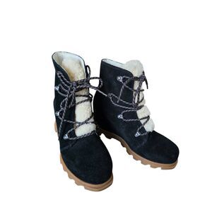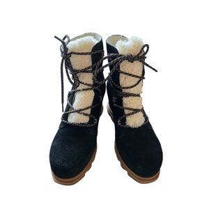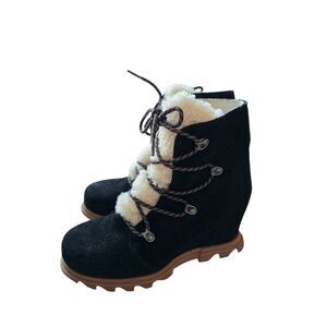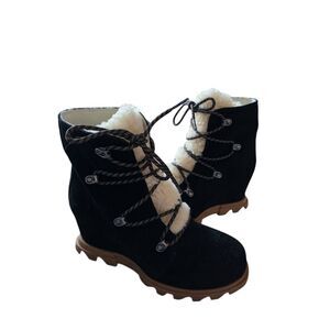 Sorel Joan of Arctic Wedge III Lace Cozy Boots Black Suede Women 7.5 NEW