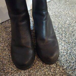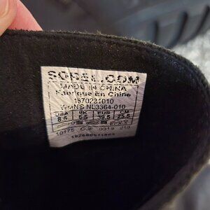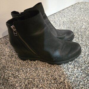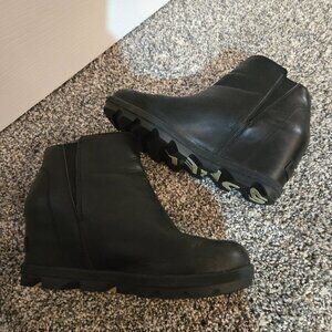 Sorel Joan of Arctic Wedge boots. These are black leather with a zipper on the side. They are a size 8.5.
