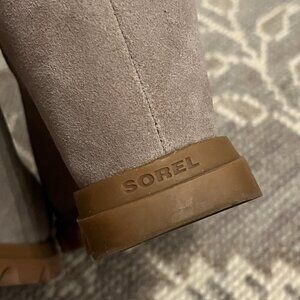 Sorel Joan of Arctic zip wedge ankle winter bootie, women's size 8. Grey/taupe suede exterior. Zippers on outside for easy on/off. Heel height (wedge) approximately 3.5 inches.