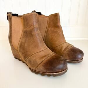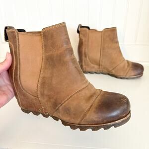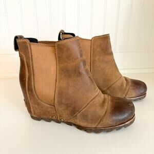 Details: Sorel Joan of Artic Lea Wedge Ankle Chelsea Bootie - Size: 7.5 - Color: Elk Brown - Material: Leather - Features: Rubber soles. Leather uppers. Approximate outside dimensions: 9.75 inches long heel to toe by 3.5 inches widest width at ball of footwear by 7 inches tall. NL2334