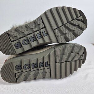 Sorel Joan of Artic Next Boot Waterproof Faux Fur. Color: Sage. Size 7. Bold urban chic design, these boots combine style with functionality. Upper leather and suede, mid calf, lace up, round toe. Seam-sealed waterproof construction keeps out the wet elements for a drier foot environment. Shearling tongue with logo, faux fur trim at the collar for added warmth and style. Soft micro fleece lining. The outsole has the new traction innovation with a pattern disruption- a newer sole design in order to increase the traction on the specific areas of the foot which receives more foot to ground contact. Slight platform lift. Great for winter outdoor activities, ski trips, heavy snow, college life. Stay warm and fashionable in these boots. Preowned with light wear- mainly some marks on the outer rim of the sole- please see pictures. Please see pictures for approximate measurements. Winter, snow, skiing, ski trips, outdoor activities.