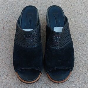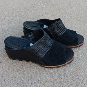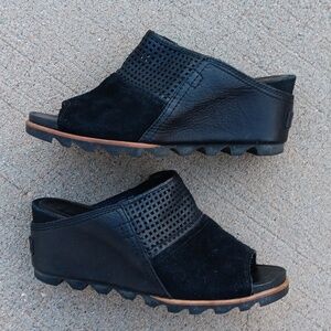 Sorel Joanie open toe wedge suede leather black slip on mules shoes