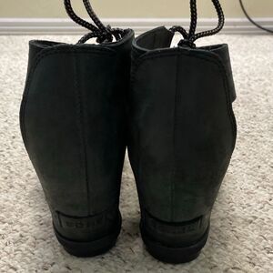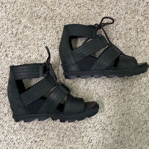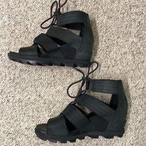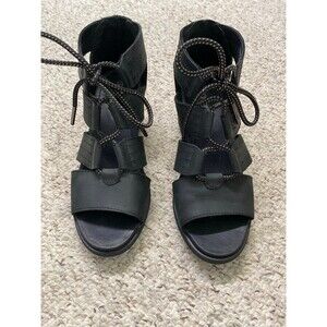 Sorel Joanie II Lace-Up Black Leather Wedge Sandals Womens Size 8 Nubuck Leather