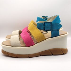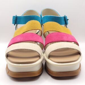 Sorel Joanie III Ankle Strap Wedge Sandals. US Women's Size 8.5. Multicolor Leather straps Teal Pink, Yellow with buckle closure. White and Gum Sole. New/unworn without Box or tags. Writing on sole blocked out.