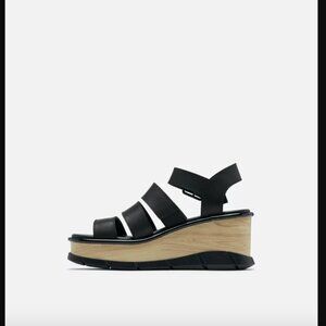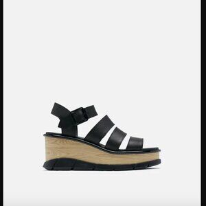 Sorel Joanie III Black Ankle Strap Wedge Sandal Heels 9.5. SUMMER RETRO - The ultimate lightweight retro summer wedge. UPPER: Full grain leather with metal hardware buckle. Rubber welt or TPU high-shine welt. Synthetic lining. FOOTBED: Soft PU-like EVA footbed for extra comfort underfoot. Synthetic topcover. Metallic SOREL logo. MIDSOLE: Molded BPU-PU wedge wrapped in either a faux woodgrain or EVA. OUTSOLE: Molded high-traction rubber in a new forward motion design with lightweight ground contact EVA. HEEL HEIGHT: 2 3/4 in. with a 1 1/2" platform Strappy leather elasticized sandal. Adjustable ankle strap. Cushioned EVA footbed. High traction rubber sole. Worn a few times with light signs of wear. elastic on ankle straps are a little stretched out but the buckle covers it!