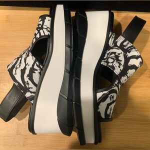 NEW!! Sorel Womens Joanie lll Black/White Slingback Wedge Sandal. Heel ht-3’, platform ht - 1 1/2’. Size: 10; EXCELLENT NEW without box condition!