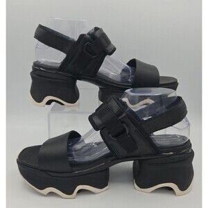 The Sorel Kinetic Impact Slingback Sandals in women's size 10 feature a platform block heel design, making them stylish and comfortable for casual occasions. The sandals have a mid-height block heel and a slingback style with a hook-and-loop closure for easy wear. Made with leather material and a rubber outsole, these sandals are perfect for summer, fall, and spring seasons. The solid black color adds a versatile touch to any outfit, making them a must-have for any woman's wardrobe. Heel Height Approx 2 Inches Platform Height Approx 1.25 Inches Smoke Free Home Bin 11