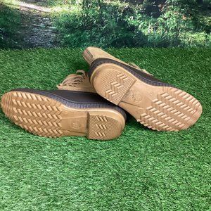 Leather upper, rubber lower, classic duck boot look. Waterproof with removeable liner. Lace up style. Good used condition.