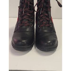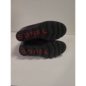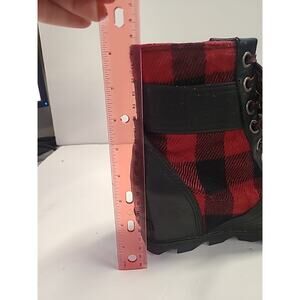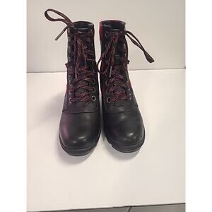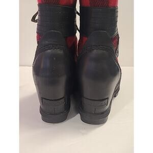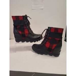 Keywords: Sorel Lexie Boots Women's 8 Black Red Leather Buffalo Plaid Hidden Wedge Booties