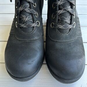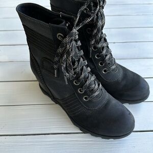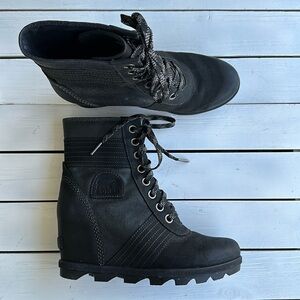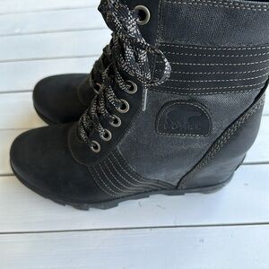 This sleek wedge bootie feels as good as it looks, even in the harshest weather. Crafted of supple waterproof full-grain leather and rich coated canvas for a unique play on texture and color, you can pair it with anything. The boots supportive arch, molded EVA footbed and rubber outsole provide walk-anywhere comfort.
