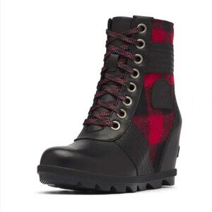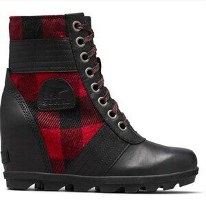 Sorel Lexie Wedge Boots Black Red Leather Buffalo Plaid NL3377-010 Women's 8.5