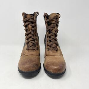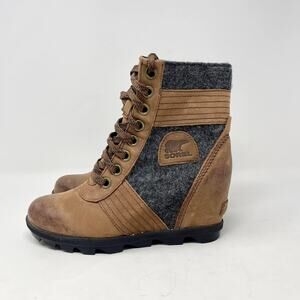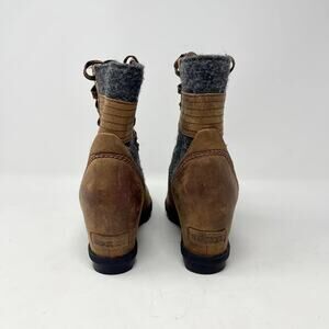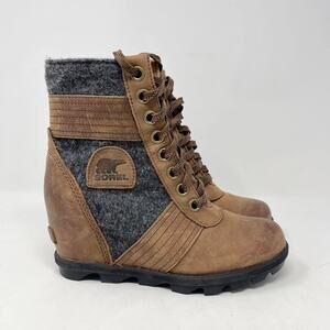 Sorel Lexie Wedge Lace Up Brown Leather Gray Felt Weatherproof Boot
