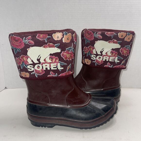 Sorel Maroon Floral Waterproof Slip-On Snow Boots Size 3 Fleece Lined.