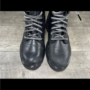 Up for sale is a pair of Sorel NL4843 Lennox Waterproof Black Hi-Line Lace Up Leather Booties Boots. Size 8. Rubber soles. Leather uppers. Approximate outside dimensions: 11 inches long heel to toe by 4.25 inches widest width at ball of footwear by 7.5 inches tall.