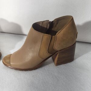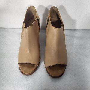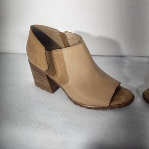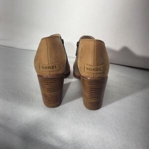 The Sorel Nadia Ankle Bootie in women's size 11 is a stylish and versatile shoe perfect for casual occasions. Made of high-quality leather with a chunky block heel, these tan boots feature an open toe and zipper accents for added flair. The ankle shaft style and solid pattern make them a trendy choice for any outfit, while the Sorel brand ensures both quality and durability. Perfect for fall and winter, these fashionable booties are a must-have for any woman's shoe collection.