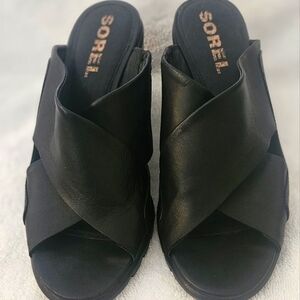 Sorel Nadia Slip On Peep Toe Mule Black Leather Block Heel Sandals Wmn's Size 9
