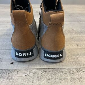 Sorel boots with a rugged design. Waterproof. Features black, brown, and gray tones. Ideal for outdoor wear.