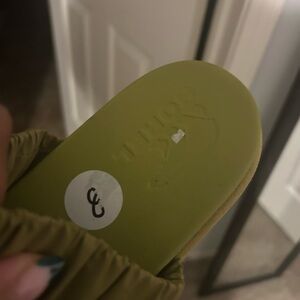 Stylish olive green slide sandals with ruched straps. Perfect for casual wear.