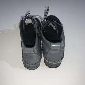 Color: Gray upper with black rubber lower and contrasting light gray midsole stripe; black and white two-tone laces.